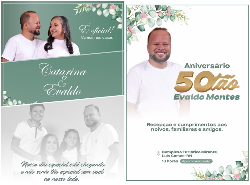 O comunicador Evaldo Montes e Catarina vivem um momento especial e repleto de significados. O casal vai oficializar a união no dia 12 de dezembro, em cerimônia na Igreja Matriz de Senhora Santana, em Luís Gomes/RN. Após o casamento, Evaldo também celebra seus 50 anos de vida com uma recepção no Complexo Turístico Mirante, reunindo familiares e amigos para comemorar as duas datas marcantes. A coluna agradece a gentileza do convite e deseja muitas felicidades ao casal!