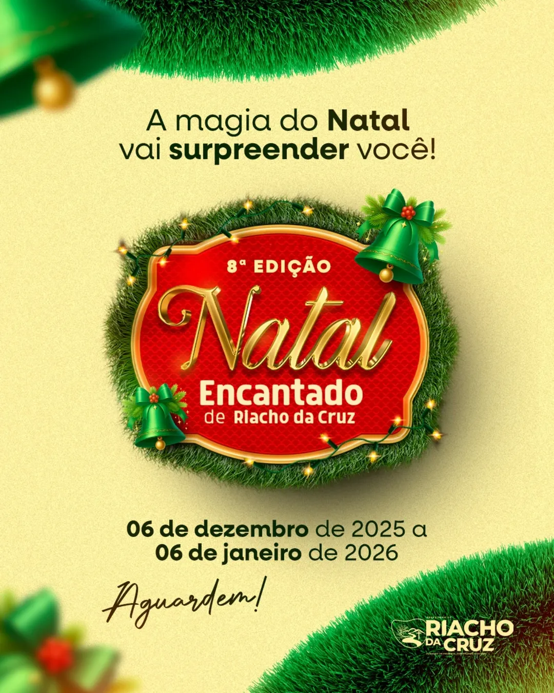 Agradecemos ao prefeito Marcos Aurélio, de Riacho da Cruz/RN, pelo convite para prestigiar a 8ª edição do Natal Encantado, que será realizada de 06 de dezembro de 2025 a 06 de janeiro de 2026. O evento, totalmente gratuito, transforma a Avenida Camila de Lélis em um cenário iluminado repleto de atrações culturais, artísticas e religiosas, com destaque para o Trenó-Móvel, a Casa do Papai Noel, apresentações de dança e corais, teatro Auto de Natal, estátuas vivas, bandas filarmônicas, economia criativa, gastronomia e muito mais. Uma programação que emociona, valoriza a tradição e movimenta toda a região.