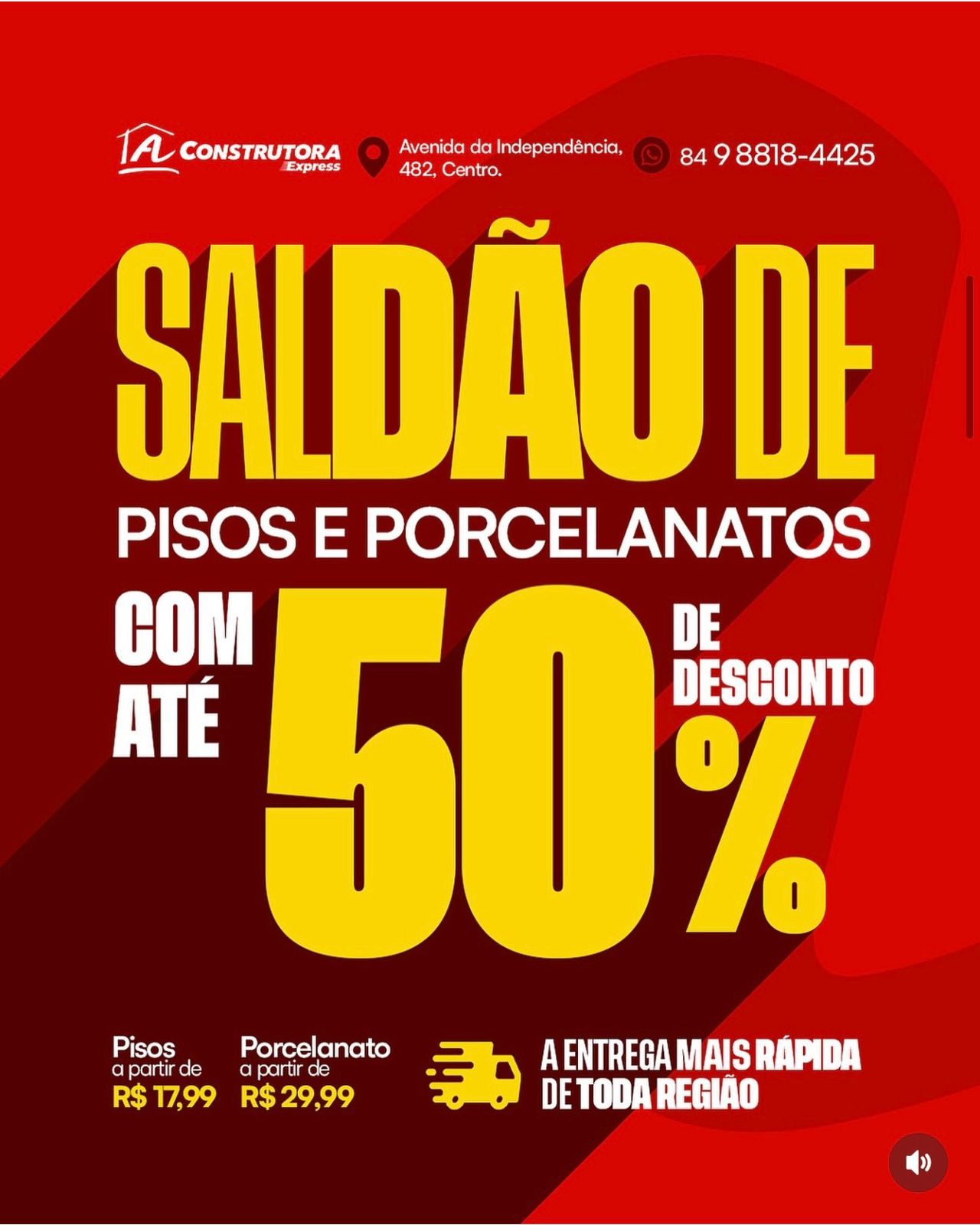 A transmissão ao vivo promete ser a maior live de pisos e porcelanatos da região, com destaque para promoções imperdíveis: pisos a partir de R$ 17,99 e porcelanatos a partir de R$ 29,99. Uma excelente oportunidade para quem está construindo, reformando ou planejando dar uma repaginada nos ambientes.