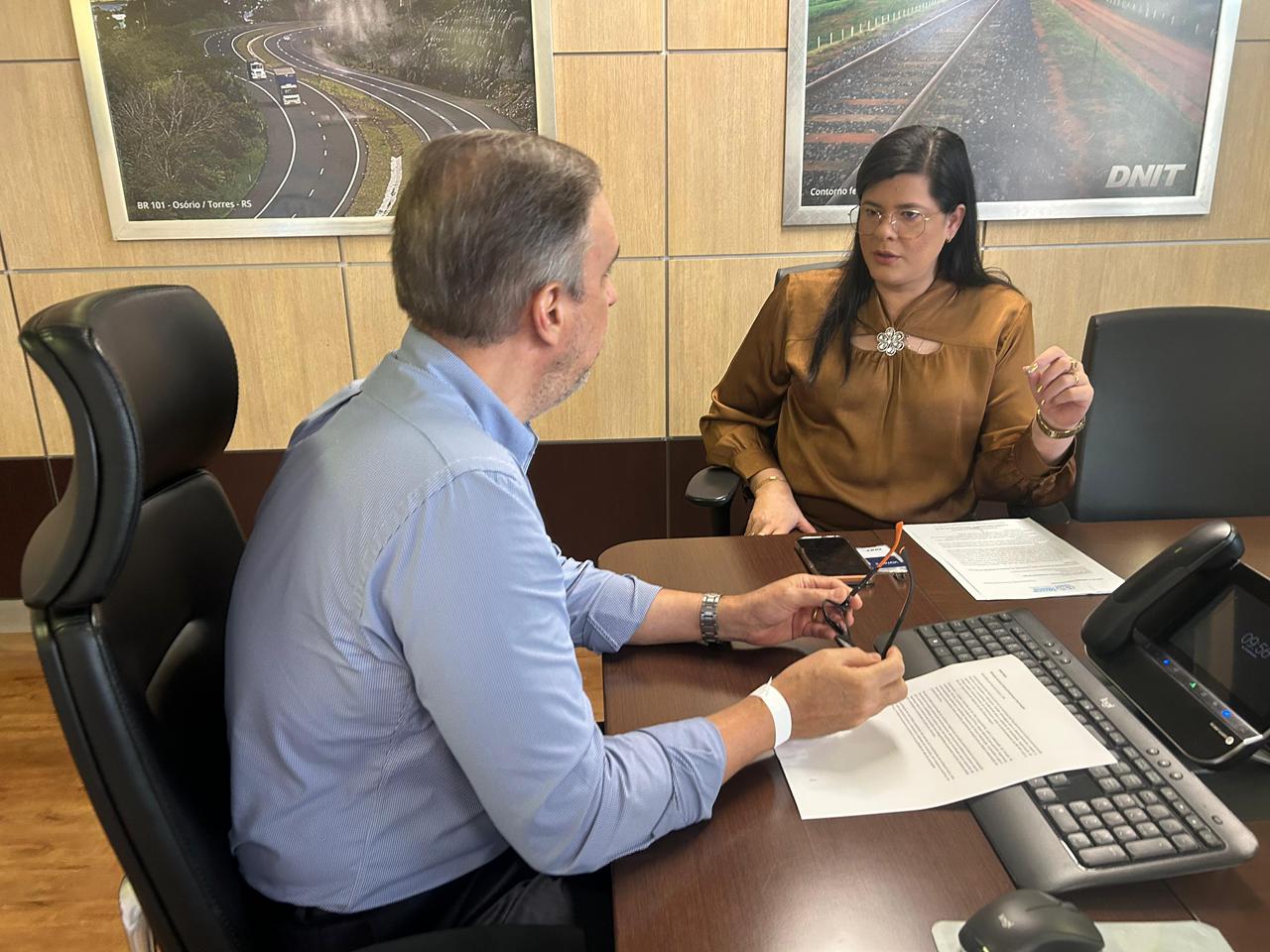 Em reunião com o assessor técnico da Direção Executiva do DNIT, Roberto Borges, a gestora tratou do Anel Viário, uma das principais reivindicações defendidas pela administração municipal desde o primeiro ano de gestão. A pauta tem sido apresentada de forma constante nas agendas institucionais na capital federal.