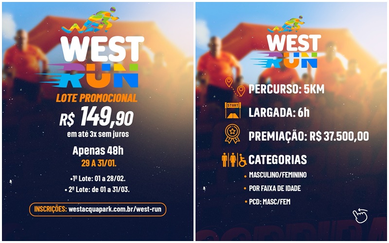 Os interessados devem garantir participação por meio do site oficial do evento: westacquapark.com.br/west-run. A expectativa é de que a West Run consolide-se como mais um evento esportivo de destaque no calendário regional, incentivando a prática esportiva e fortalecendo o turismo e o lazer na região.